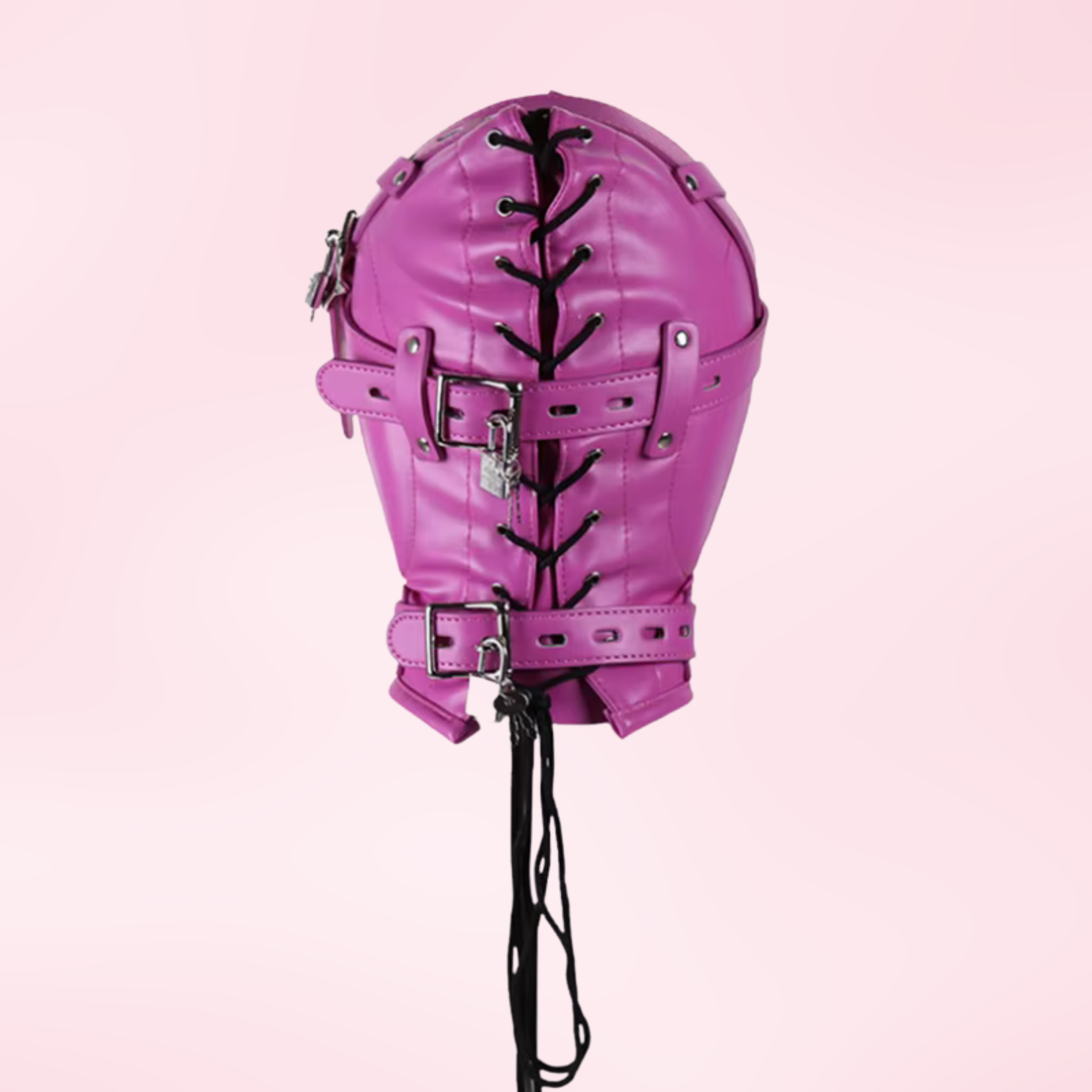 Elevate your play with a strong, stylish hood that blends comfort, control, and creativity. Crafted from soft, non-toxic PU leather, this full-face hood is both breathable and durable for extended wear. The lace-up back offers a customizable fit, while adjustable, lockable straps at the eyes, head, and neck let you fine-tune restraint and sensation. A removable plug connects via a sturdy chain and O-ring for easy fitting and quick removal, so you can switch up the experience in seconds.